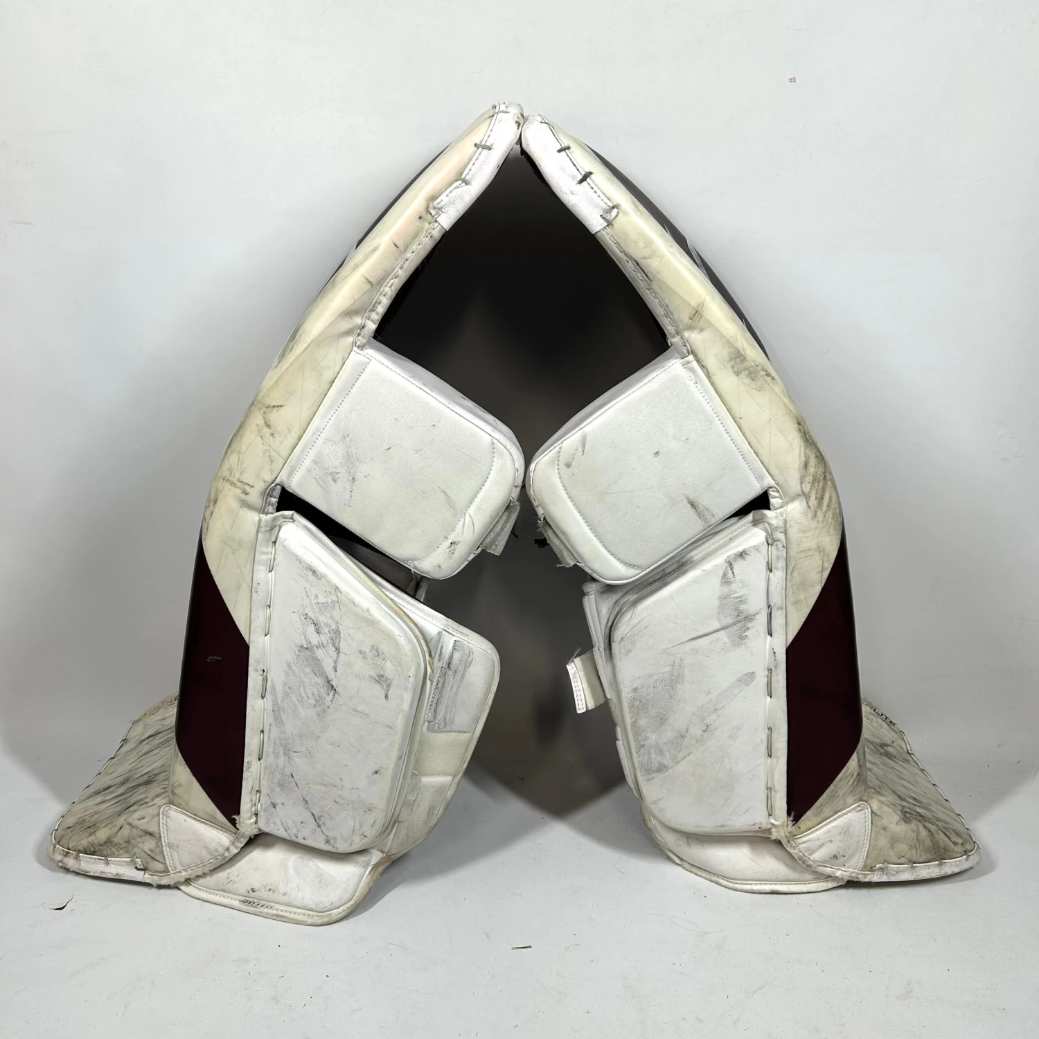 These pads are in excellent condition with no tears and all straps work as intended. With just general puck marks and wear on the outside there are no areas of concern regarding the condition of these pads. These pads measure as a total length of 35″ but have a listing size of large 35+.
