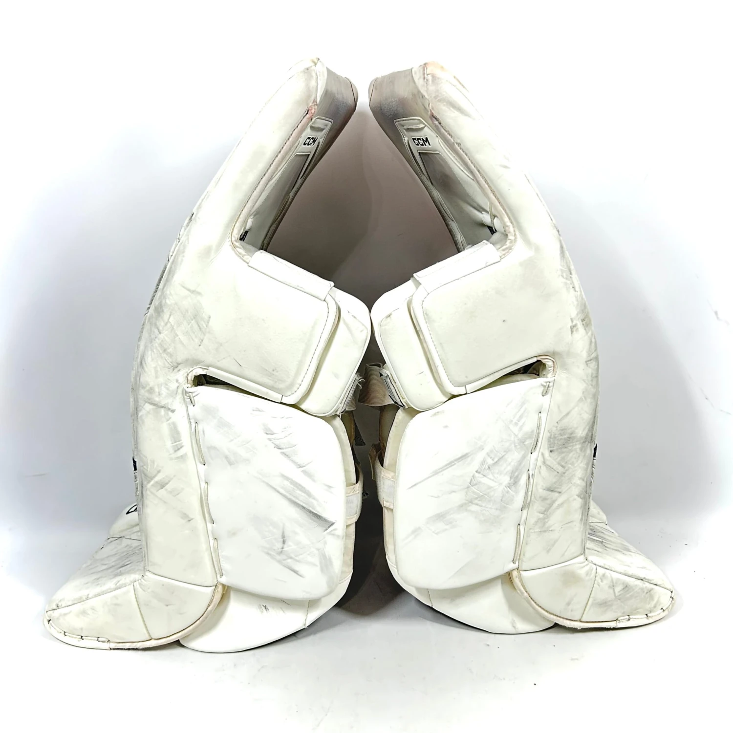 These pads are in excellent used condition with puck marks to show use. All straps and buckles work as intended. These pads are approved by Kay Whitmore for NHL and AHL use.