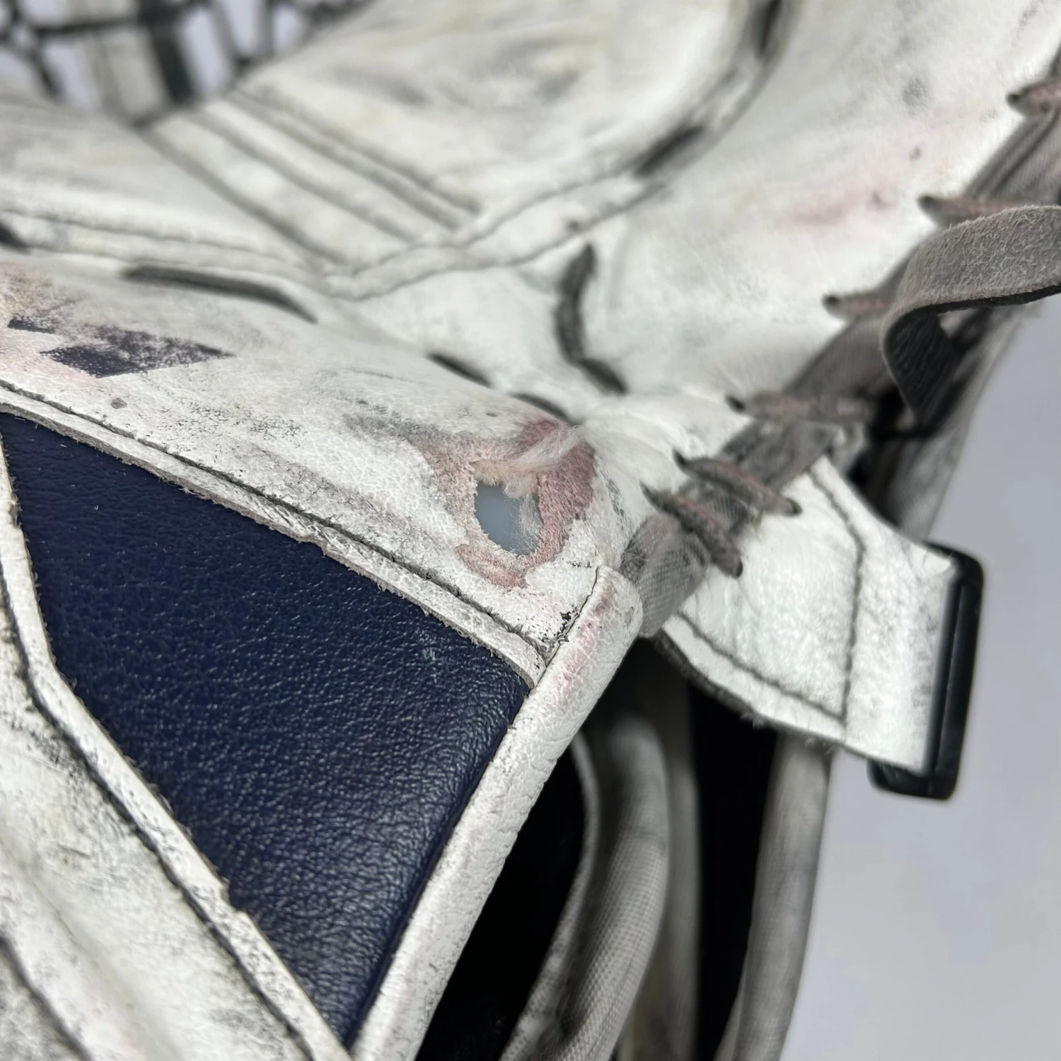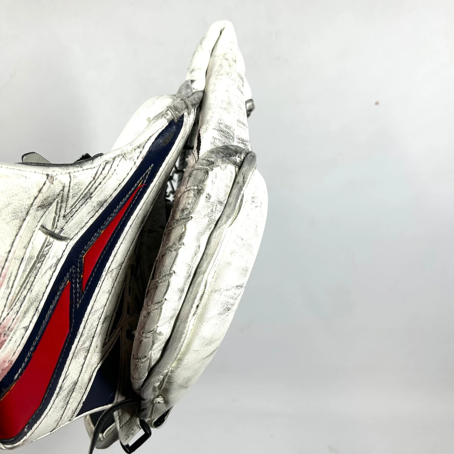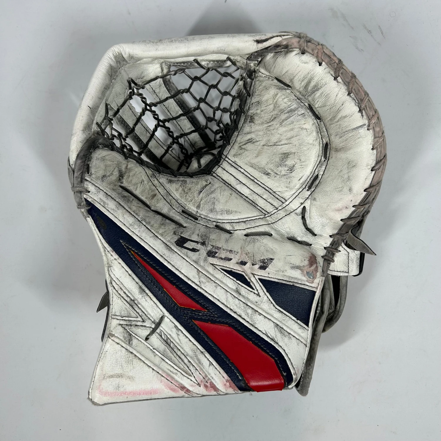 Used CCM Extreme Flex 4 glove from an NCAA team. Glove is in fair used condition with a decent amount of use and a few rips (pictured). Trapper has a double T pocket with a 590 break with good closure.