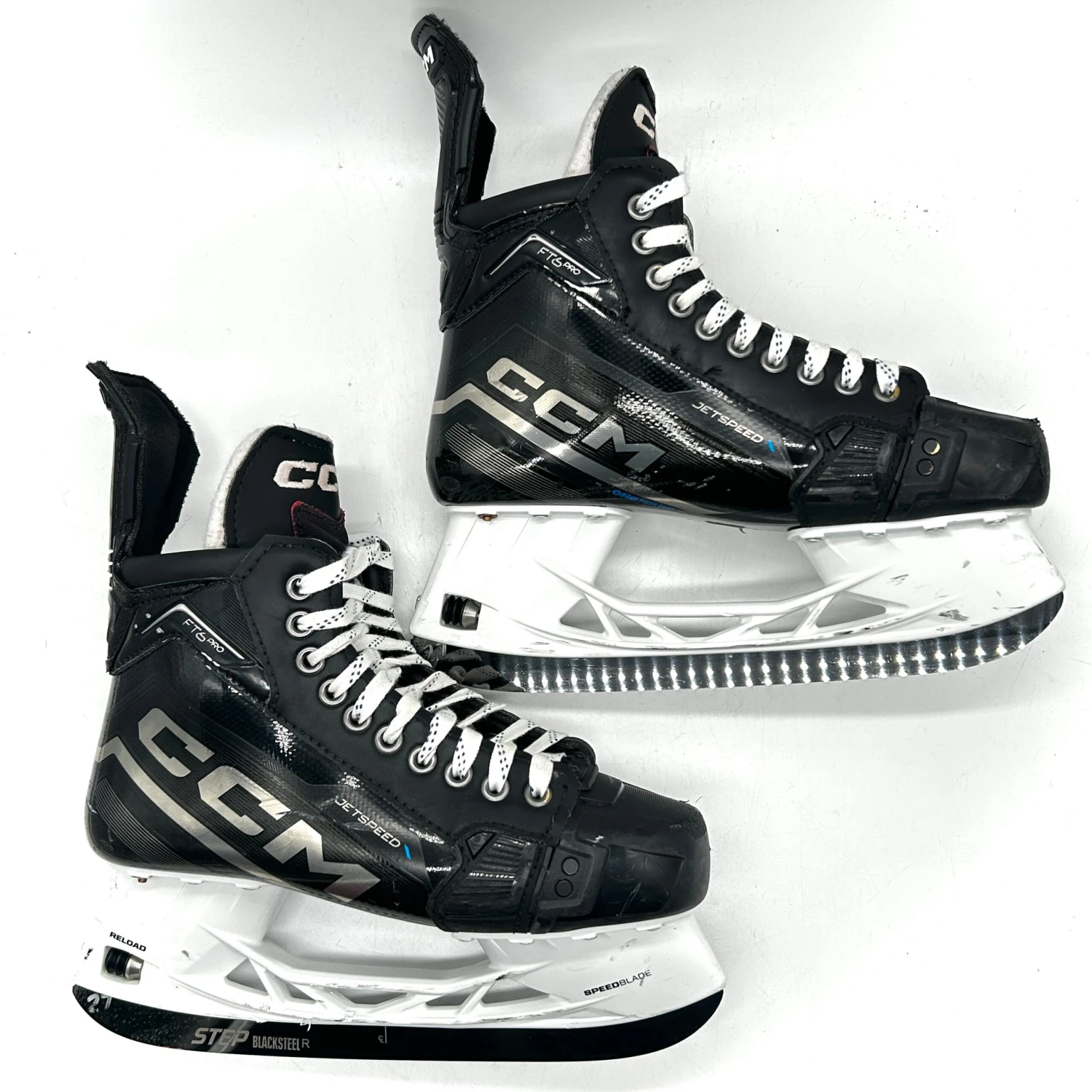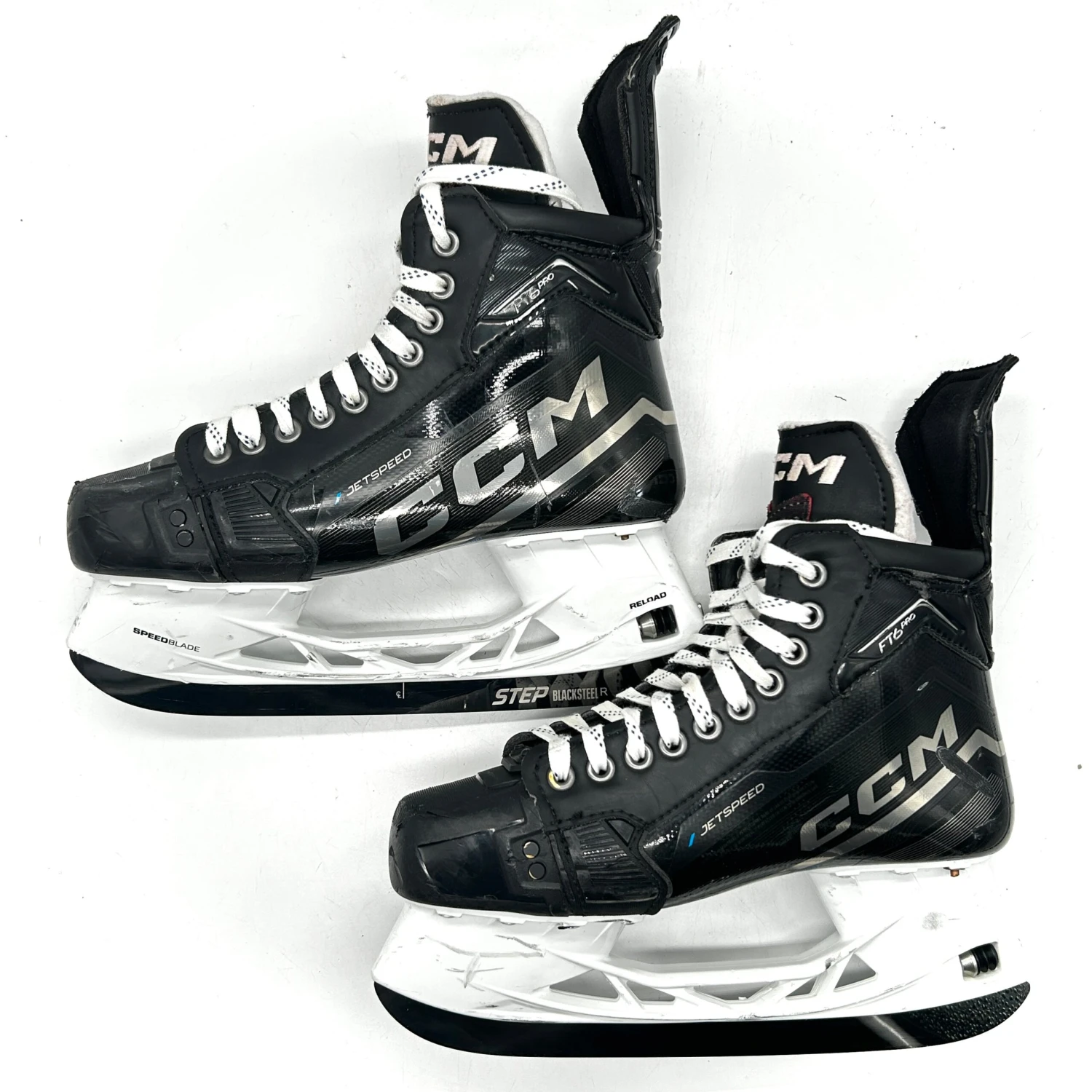 These skates are in good used condition with general wear. These skates are sized 7.5 with 271 CCM Reload holders and used black Stepsteel. Â Â