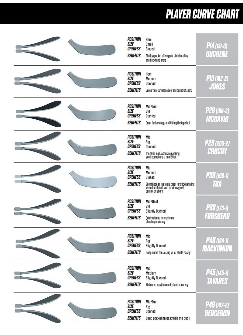 | Stick Specifications | Left – P29 (Crosby) – 60 Flex (Blade 1), Left – P29 (Crosby) – 75 Flex (Blade 1), Left – P29 (Crosby) – 80 Flex (Blade 1), Left – P29M (Crosby) – 80 Flex/64"/Max Blade (Blade 1), Left – P29 (Crosby) – 85 Flex (Blade 1), Left – P29 (Crosby) – 85 Flex/Non-Grip (Blade 1), Left – P29 (Crosby) – 85 Flex/63" (Blade 1), Left – P29 (Crosby) – 90 Flex (Blade 1), Left – P29 (Crosby) – 90 Flex/64" (Blade 1), Left – P29M (Crosby) – 90 Flex/64"/Max Blade (Blade 1), Left – P29 (Crosby) – 90 Flex/65" (Blade 1), Left – P29 (Crosby) – 90 Flex/67" (Blade 1), Left – P29 (Crosby) – 95 Flex (Blade 1), Left – P29 (Crosby) – 95 Flex/64" (Blade 1), Left – P29 (Crosby) – 95 Flex/65" (Blade 1), Left – P29 (Crosby) – 95 Flex/Non-Grip (Blade 1), Left – P29 ( Crosby) – 100 Flex (Blade 1), Left – P29 (Crosby) – 105 Flex/64" (Blade 1), Left – P29 (Crosby) – 110 Flex/64" (Blade 1), Left – P29C (Crosby) – 65 Flex (Blade 1 Custom), Left – P29C (Custom) – 90 Flex/62" (Blade 1 Custom), Left – P29 Deep/Square Toe – 80 flex (Blade 1 Custom), Left – P88 (Ovechkin) – 80 Flex/63" (Blade 2), Left – P88 (Ovechkin) – 85 Flex (Blade 2), Left – P88 (Ovechkin) – 85 Flex/64" (Blade 2), Left – P88 (Ovechkin) – 90 Flex/64" (Blade 2), Left – P80 (Ovechkin) – 90 Flex/Non-Grip (Blade 2), Left – P40 (MacKinnon) – 85 Flex (Blade 2), Left – P40 (MacKinnon) – 95 Flex/64" (Blade 2), Left – P14 (Duchene) – 90 Flex/64" (Blade 3), Left – P15M (Jones) – 80 Flex/Max Blade (Blade 4), Left – P15 (Jones) – 85 Flex (Blade 4), Left – P15 (Jones) – 95 Flex/64" (Blade 4), Left – P6M (Phaneuf) – 95 Flex/Max Blade/64" (Blade 4), Left – P15 (Jones) – 100 Flex/64" (Blade 4), Left – P15 (Jones) – 105 Flex (Blade 4), Left – P15 Custom – 95 Flex/64" (Blade 4 Custom), Left – P15 Custom – 100 Flex/64" (Blade 4 Custom), Left – P45 (Tavares) – 90 Flex (Blade 5), Left – P28 (McDavid) – 75 Flex (Blade 6), Left – P28 (McDavid) – 80 Flex (Blade 6), Left – P28 (McDavid) – 85 Flex/64" (Blade 6), Left – P28 (McDavid) – 90 Flex (Blade 6), Left – P28 (McDavid) – 90 Flex/65" (Blade 6), Left – P28M (McDavid) – 95 Flex/64"/Max Blade (Blade 6), Left – P28M (McDavid) – 105 Flex/Max Blade (Blade 6), Left – P50 (Gagne) – 95 Flex (Blade 8), Left – P49 (Toews) – 80 Flex (Blade 9), Left – P49M (Toews) – 85 Flex/Max Blade (Blade 9), Left – P19 (Nugent-Hopkins) – 80 Flex (Blade 10), Left – P19 (Nugent-Hopkins ) – 80 Flex/65" (Blade 10), Left – P19 (Nugent-Hopkins) – 85 Flex (Blade 10), Left – P19 (Nugent-Hopkins) – 95 Flex (Blade 10), Left – P19M (Nugent-Hopkins) – 90 Flex/Max Blade (Blade 10), Left – P19M (Nugent-Hopkins) – 90 Flex/64"/Max Blade (Blade 10), Left – P19 (Nugent-Hopkins) – 95 Flex/64" (Blade 10), Left – P19 (Nugent-Hopkins) – 95 Flex/65" (Blade 10), Left – P90TM (Pro Benn) – 100 Flex/Max Blade/Non-Grip/67" (Blade 12), Left – P71 (Pro Malkin) – 85 Flex (Custom), Left – P71M (Pro Malkin) – 95 Flex/Max Blade (Custom), Left – Pro Jagr – 85 Flex (Custom), Left – Pro O'Reilly – 85 Flex/Non-Grip (Custom), Left – P29C (Similar to Crosby) – 85 Flex (Blade 1 Custom), Left – P29C (Crosby) – 90 Flex (Custom), Left – P71C (Pro Malkin Toe Variation) – 75 Flex/62"/Non-Grip (Custom), Left – P46C (Bergeron) – 85 Flex (Custom), Left – Deep Mid – 95 Flex (Custom), Left – Big Toe/Max Blade – 95 Flex/64" (Custom), Left – Toe Curve – 100 Flex/Custom Toe Max/64" (Custom), Left – Custom Heel – 95 Flex (Custom), Left – Custom Toe – 90 Flex/64" (Custom), Right – P29M (Crosby) – 80 Flex/Max Blade (Blade 1), Right – P29 (Crosby) – 100 Flex (Blade 1), Right – P28 (McDavid) – 80 Flex (Blade 6), Right – P19 (Nugent-Hopkins) – 100 Flex (Blade 10), Left – P29 (Crosby) – 75 Flex/59" (Blade 1), Left – P29M (Crosby) – 80 Flex/62"/Max Blade (Blade 1), Left – P29M (Crosby) – 85 Flex/64"/Max Blade (Blade 1), Left – P29 (Crosby) – 95 Flex/65"/Non-Grip (Blade 1), Left – P90M (Crosby) – 100 Flex/64"/Max Blade (Blade 1), Left – P29M (Crosby) – 105 Flex/65"/Max Blade (Blade 1), Left – P88 (Ovechkin) – 80 Flex (Blade 2), Left – P80M Custom – 90 Flex/64"/Max Blade (Blade 2 Custom), Left – P14 (Duchene) – 75 Flex/59"/Non-Grip (Blade 3), Left – P15C (Similar to Jones) – 95 Flex/64" (Custom Blade 4), Left – P28 (McDavid) – 95 Flex/64" (Blade 6), Left – P28 (McDavid) – 100 Flex/ 64" (Blade 6), Left – P28C (Similar to McDavid) – 90 Flex (Custom Blade 6), Left – P19 (Nugent-Hopkins ) – 80 Flex/63" (Blade 10), Left – P19 (Nugent-Hopkins) – 90 Flex (Blade 10), Left – P71 (Pro Malkin) – 85 Flex/64" (Custom), Right – P28 (McDavid) – 95 Flex/62" (Blade 6), Right – P71M (Pro Malkin) – 105 Flex/64"/Max Blade (Custom), Left – P28M (McDavid) – 90 Flex/65"/Max Blade (Blade 6), Left – P02 (Lindstrom) – 75 Flex (Blade 7), Left – P20 (Getzlaf) – 80 Flex (Blade 7), Left – P49 (Toews) – 85 Flex (Blade 9), Left – P71MC (Custom) – 100 Flex/64"/Max Blade (Custom), Left – P71 (Pro Malkin) – 95 Flex/63" (Custom), Left – Pro Beleskey – 85 Flex/63" (Custom), Right – P88 (Ovechkin) – 90 Flex (Blade 2), Left – P14M (Duchene) – 110 Flex/67"/Max Blade (Blade 3), Left – P15M (Jones) – 100 Flex/67"/Max Blade (Blade 4), Left – P14 (Duchene) – 95 Flex (Blade 3), Left – P88M (Ovechkin) – 80 Flex/Max Blade (Blade 2), Right – P19 (Nugent-Hopkins) – 115 Flex/65" (Blade 10), Right – P45 (Tavares) – 85 Flex (Blade 5), Left – P90T (Tavares) – 85 Flex (Blade 12), Left – P46M (Bergeron) – 95 Flex/Max Blade (Blade 11), Left – P14M (Duchene) – 80 Flex/Max Blade (Blade 3) |