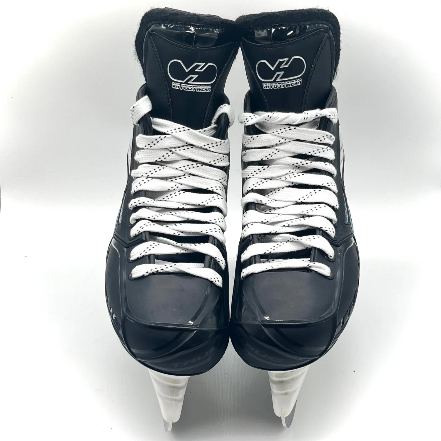 New True TF9 hockey skates. These skates appear to be retail but are sourced from a Pro locker room and feature a custom skate tongue. These skates have size 296 Lightspeed Edge holders and LS Pulse TI steel.