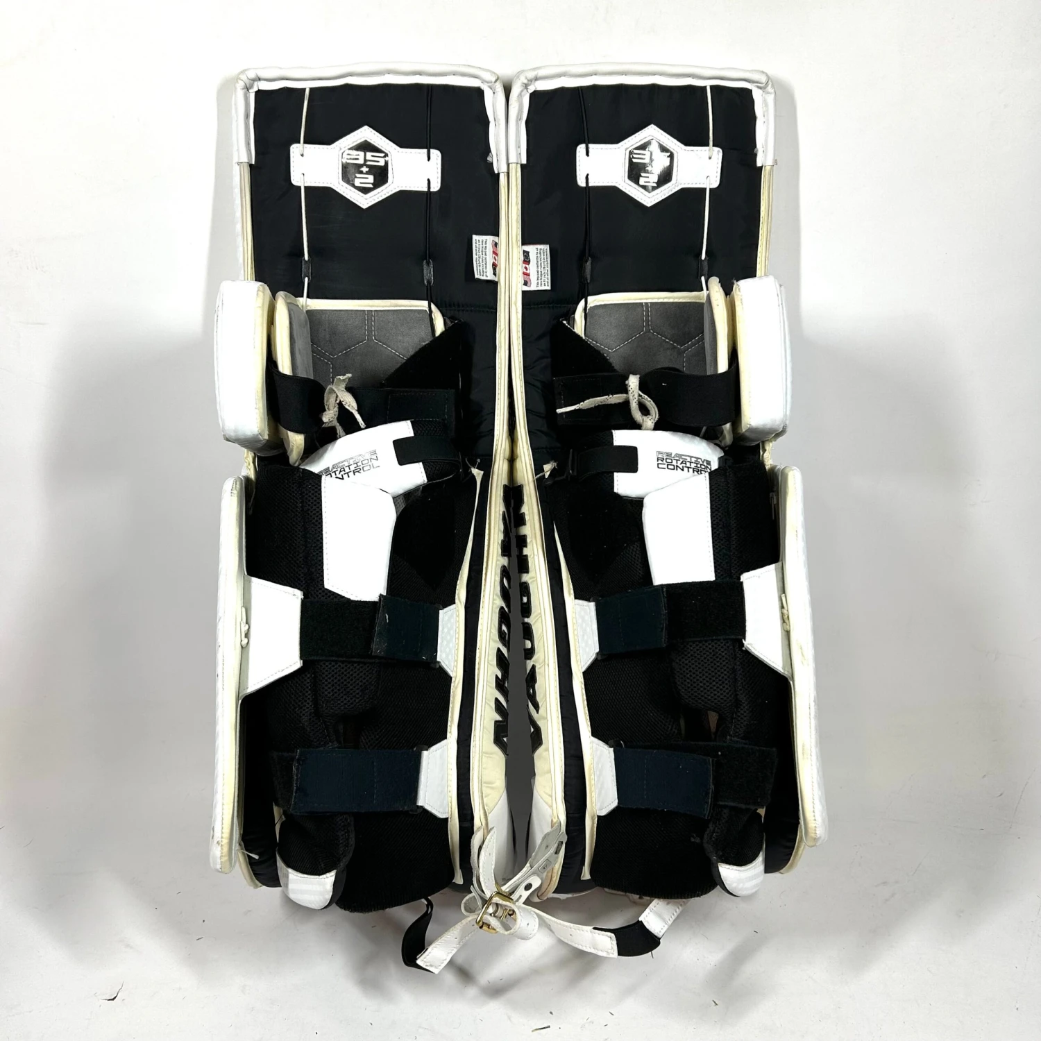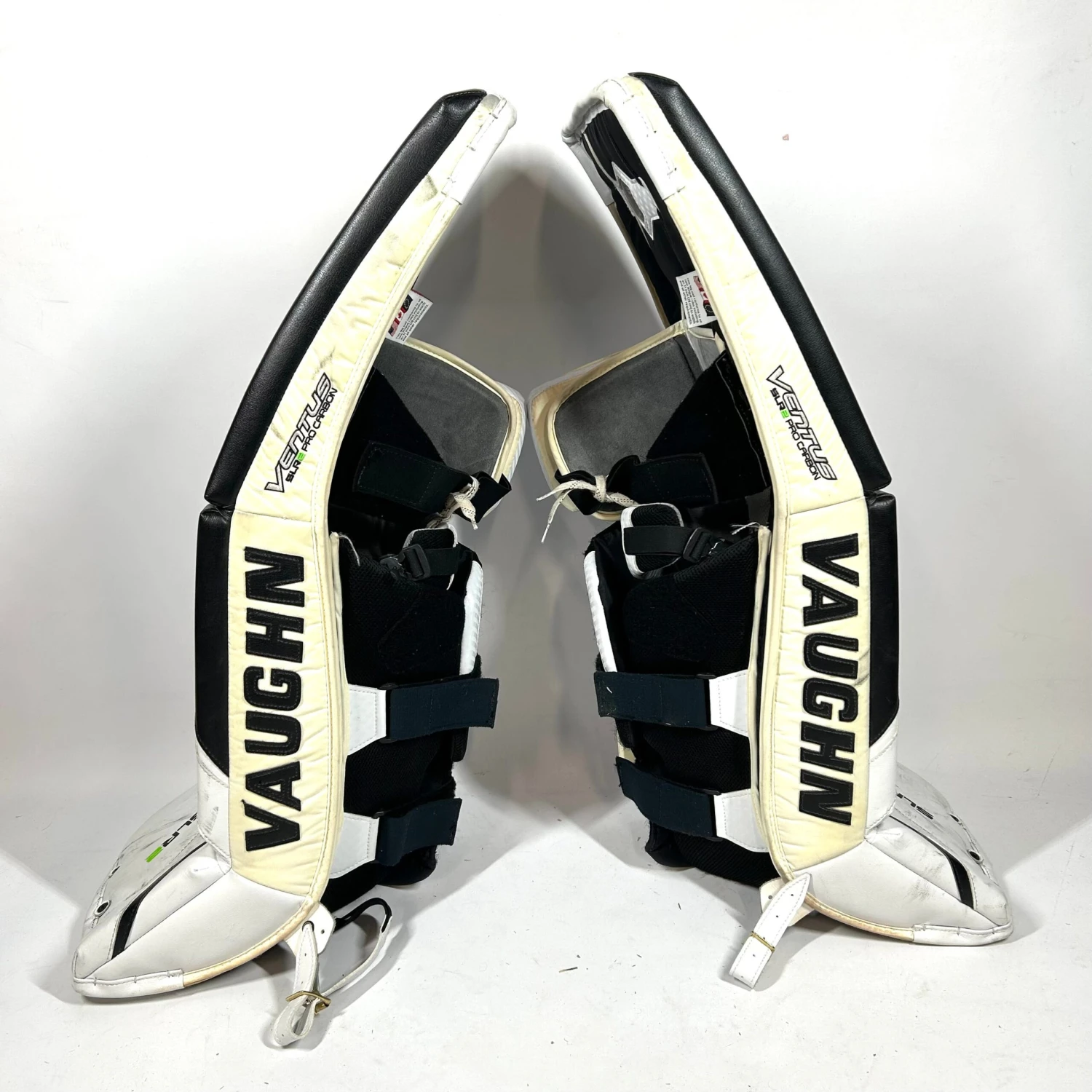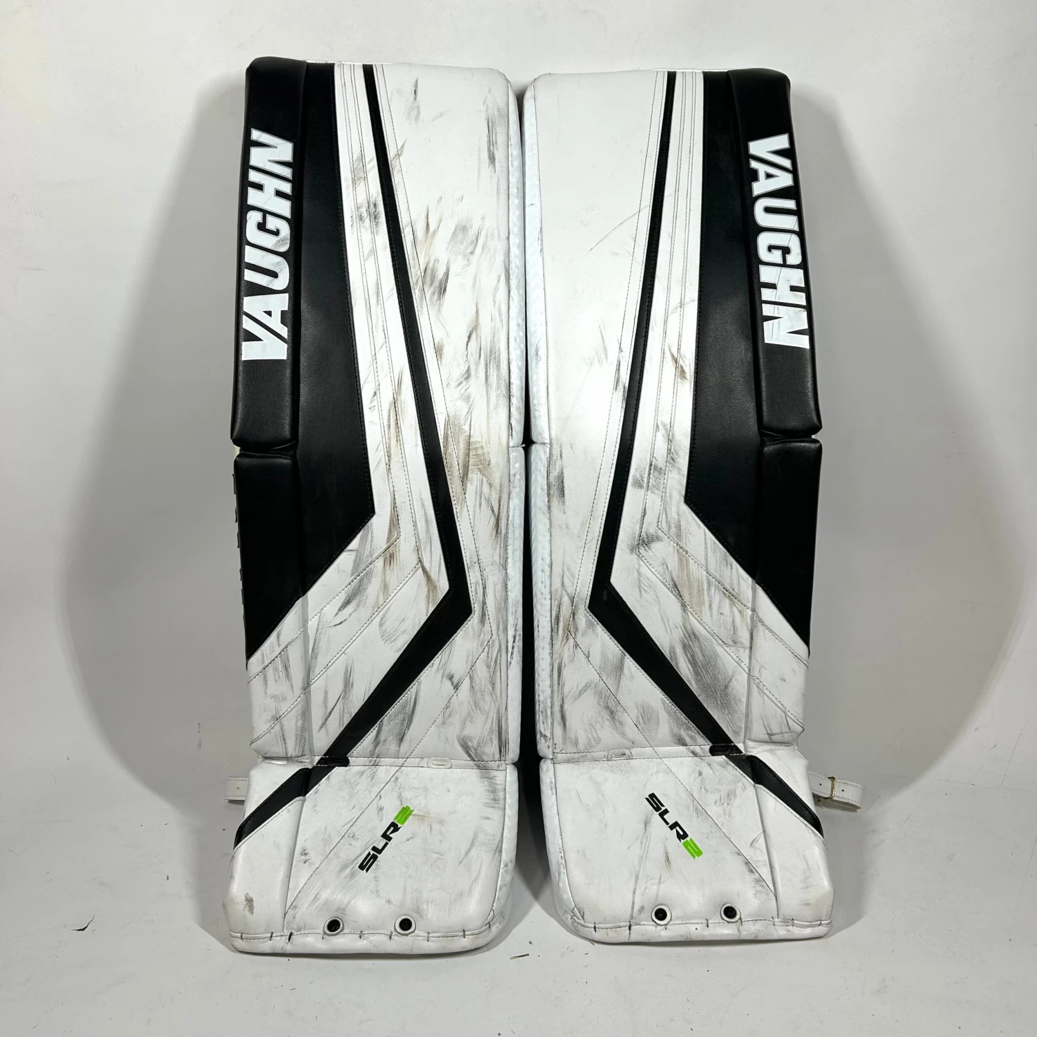 Used Vaughn Ventus SLR2 leg pads from an NCAA team. Pads are in very good used condition with general wear and puck marks to show uses. All straps and velcro are intact and work well. These pads have a total length of 37″ and have a listed size of 35 +2″.Â