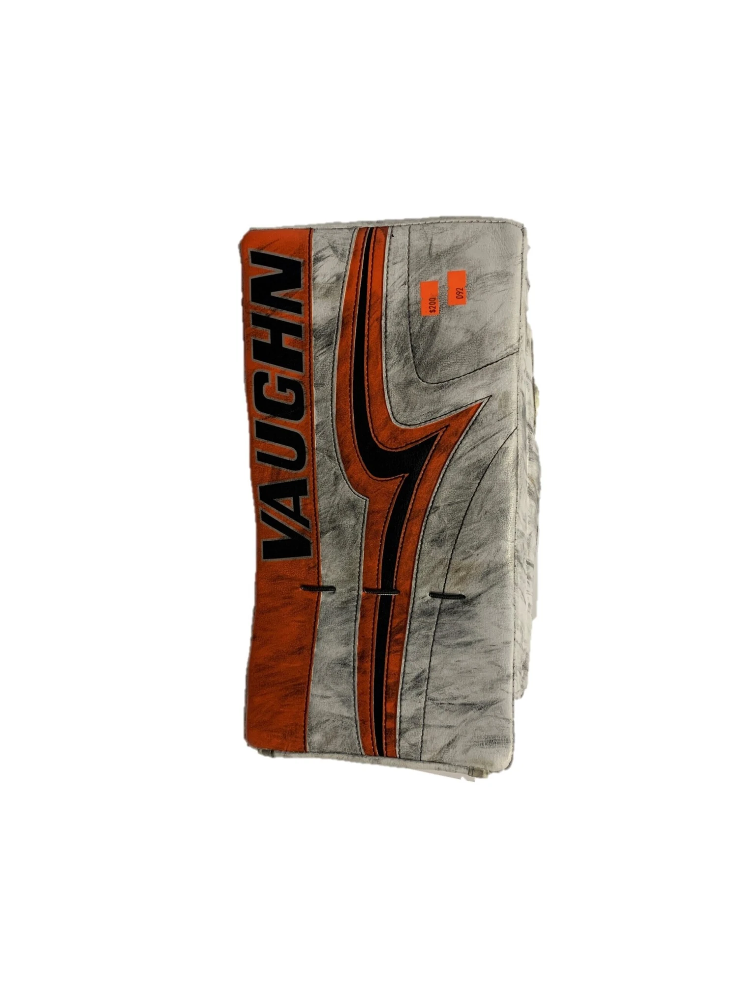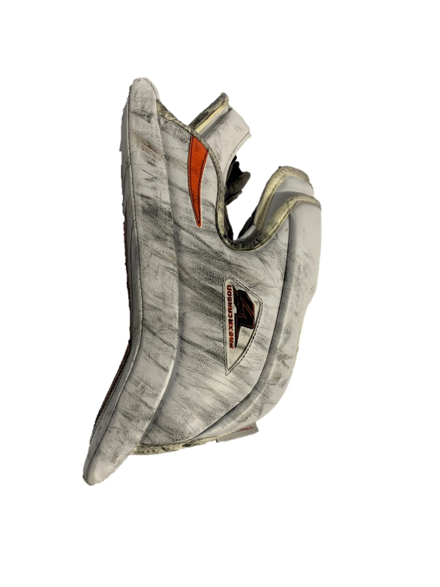 Used Bauer Vaugh Velocity V7 XR Carbon pro blocker from an NCAA team. White/Black/Orange. Blocker is in fair used condition with a decent amount of use but no areas of major concern. The blocker has no holes in the palm and no bubbling.