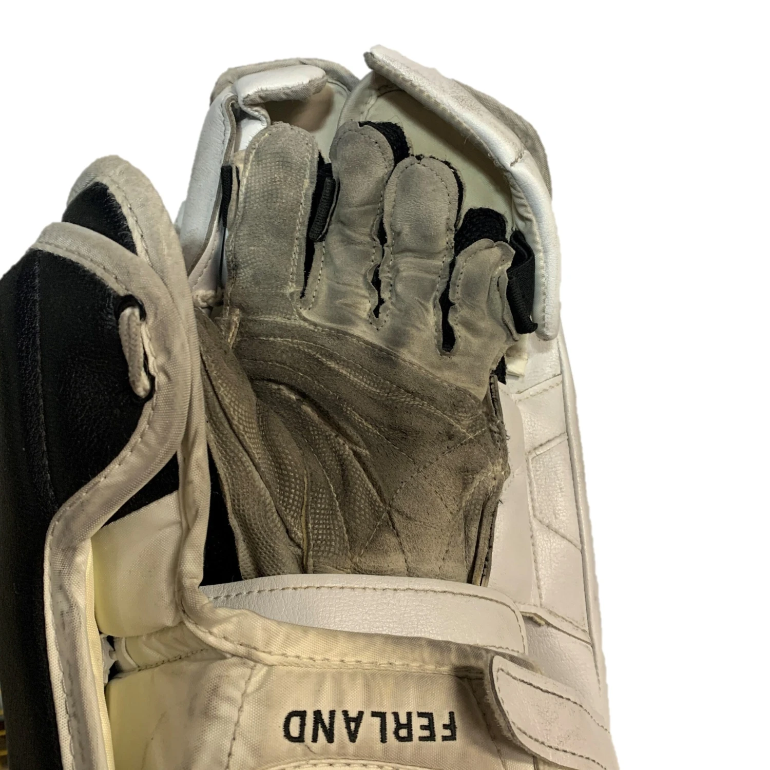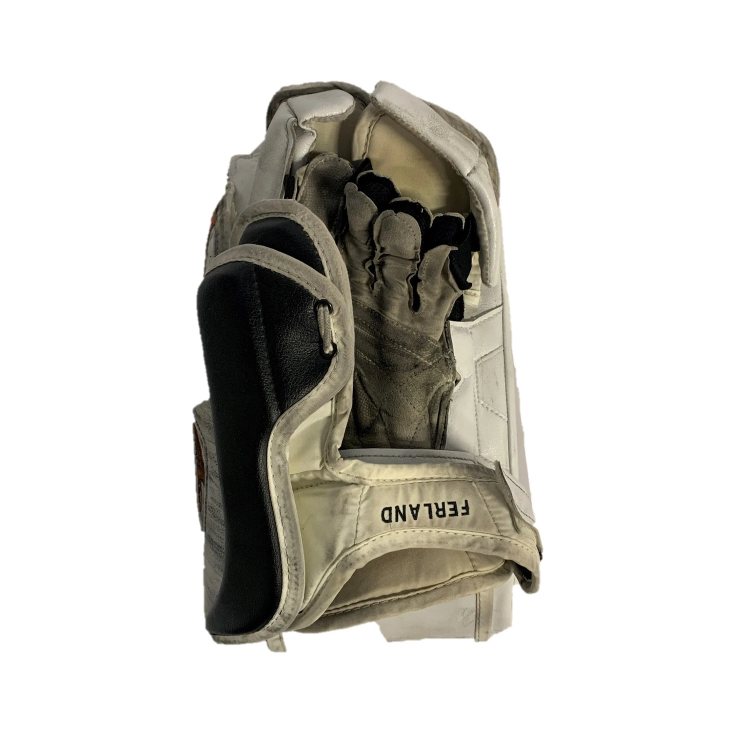 Used Bauer Vaugh Velocity V7 XR Carbon pro blocker from an NCAA team. White/Black/Orange. Blocker is in fair used condition with a decent amount of use but no areas of major concern. The blocker has no holes in the palm and no bubbling.